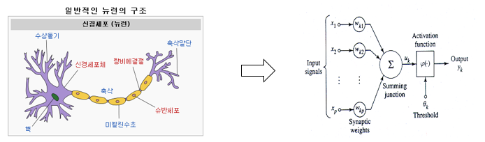 - 오른쪽 ANN의 구조를 보면 전 신경세포들의 신호가 synapse로 다음 뉴런의 dendrite로 전달되어 nucleus의 역할을