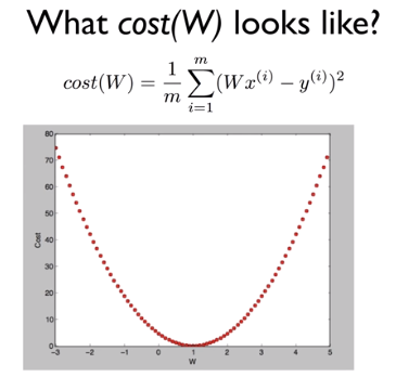 예를 들어 위와 같이 cost function을 그릴 수 있겠다. 여기서 cost function이 최소화되는 점은 0이다.