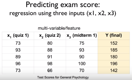 오늘 배울 것은 여러 개의 input으로 결과 하나를 예측하는 multi-variable linear regression이다.