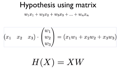 위와 같이 우리의 Hypothesis를 행렬로 표현했다. 간단하게 행렬의 곱셈을 수행하면 원하는 식을 구할 수 있다.