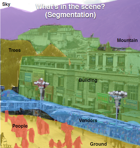 Not only finding out what objects in the image, we can find out what type of scene is it. In this case, we can come up with words such as outdoor, marketplace, city. (Type of Scene)