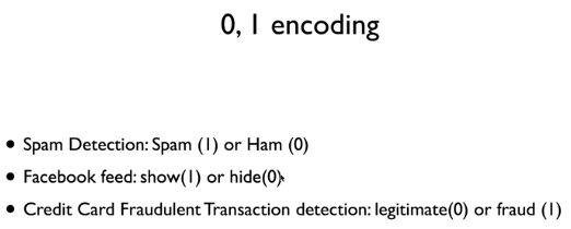 위의 2가지의 카테고리로 분류하는 것을 컴퓨터에서는 0과 1로 encoding해서 수행한다. 한 쪽 카테고리를 0,