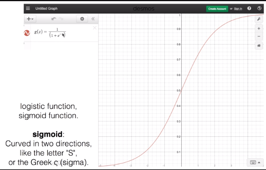 S 모양이라서 Sigmoid 함수라고 불리고 또는 logistic function이라고 불린다. x가 무한으로 커지면 g 함수의 값은 1에