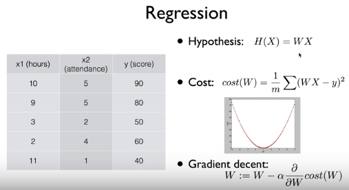 저번 시간까지 배웠던 Linear Regression을 복습해보자면 위와 같다. Hypothesis, Cost Function, Gradient Descent는 꼭 알아야할 중요한 부분이었다. Hypothesis의 형태가 선형이기 때문에 linear regression이라고 불린 것이었다.