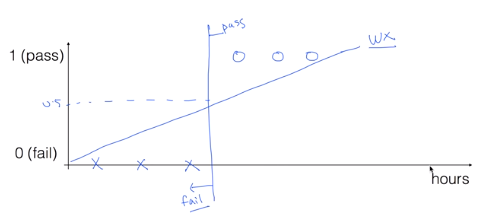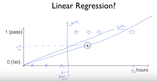 Binary Classification에 linear regression을 사용한다면 대강 위와 같은 값으로, 0.5 이상은 pass, 0.5 이하는 fail로