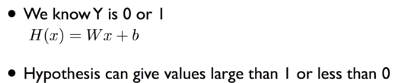 또 다른 문제로는 binary classification은 결과가 0 아니면 1로 나와야하는데 linear regression은 그 이외의 값이