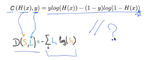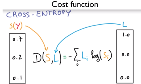 위까지 어떻게 예측을 할지를 결정했고, 이제는 우리가 예측한 값과 실제의 값이 얼마나 차이가 나는지 계산하는 cost function을 어떻게 만들지 알아보겠다. 이 때 사용하는 식 D를 Cross Entropy라고 한다. L(Label)은 실제의 값, 즉 정답이고 (Y라고 하기도 함), S(y)는 y hat이라고도 표현되고, softmax 함수를 통해서 예측한 값이다. 가운데의 식, log를 한 뒤 L을 곱해서 다 더한 것이 이 경우의 cost function이 되겠다.