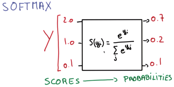 위의 그림은 softmax 함수를 간단하게 정리해놓은 것이다. sigmoid 함수를 거친 각각의 결과값은 0에서 1 사이여야하고, 그들의 합은 1이 된다. 즉, 각각을 확률로 볼 수 있게 된다.
