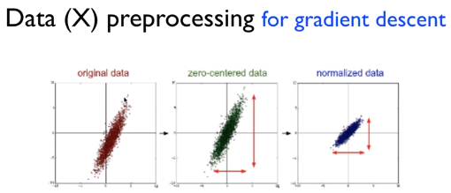 다음으로 볼 것은 데이터의 전처리이다. 만약 우리가 가지고 있는 데이터들의 값의 차이가 너무 크게 난다면 등고선을 그렸을 때 옆으로 길쭉한, 왜곡된 형태로 나타날 것이다. 그럴 떄 alpha 값이 아무리 좋더라도 쉽게 데이터 바깥으로 나가버릴 수도 있다. 가장 많이 사용하는 방법들에는 zero-centered data(가운데로 모이도록)와 normalized data(어떤 범위 내에 데이터가 들어갈 수 있게 전처리)가 있다.
