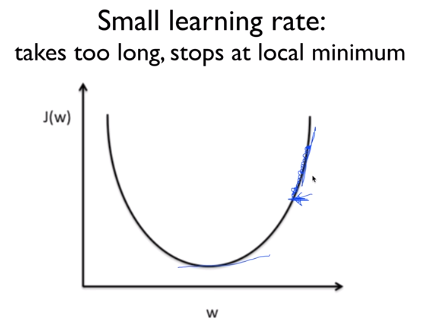 만약 learning rate를 너무 작게 설정했다면 최소값을 찾으려 너무 느리게 내려가기 때문에 시간이 너무 오래 걸려서 최소점에 아직 도달하지 않았는데 멈춰서 올바른 최소값을 구하지 못할 수도 있다. 코드에서는 시간이 지날 때마다 cost function 값을 print해서 값이 너무 조금씩 줄어든다면 learning rate를 좀 늘리는 방법으로 문제를 해결할 수 있겠다.