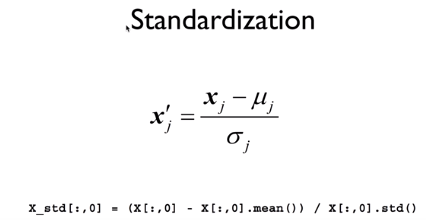 x의 값들이 있으면 x의 값을 평균과 분산의 값을 이용해서 normalization을 할 수 있고, 이 방법을 Standardization이라고 한다. 직접 코드를 구현하려면 위 그림의 아래 부분 코드를 이용하면 된다.