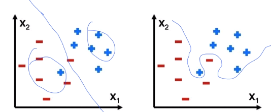 왼쪽의 모델은 조금의 오차가 있긴 하더라도 일반적으로 잘 짠 모델이고, 오른쪽의 모델은 주어진 훈련 데이터셋에 너무 잘 맞추고 싶은 나머지 overfitting되어버렸다.