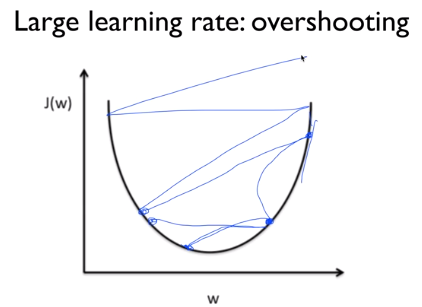 만약 learning rate를 너무 크게 설정했다면 step이 너무 커서 최소값을 제대로 찾지 못하고 지나치는 문제가 생길 수 있다. 심한 경우에는 그래프 바깥으로 튀어나가기까지 해서 제대로 된 학습을 하지 못할 수 있다. 코드의 결과는 숫자가 아닌 값까지 출력될 수도 있으며, 이 현상을 Overshooting이라고 한다.