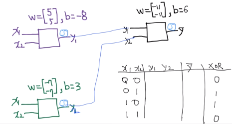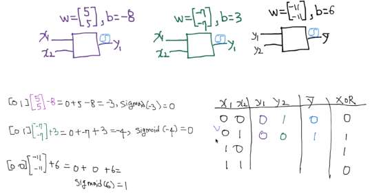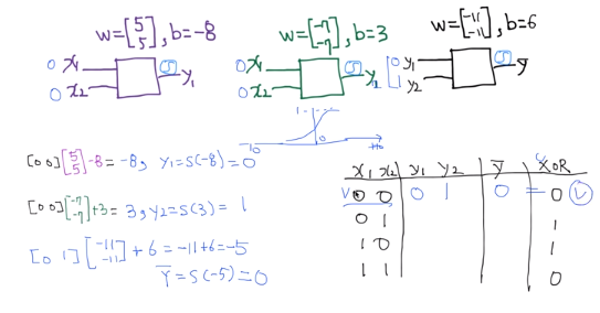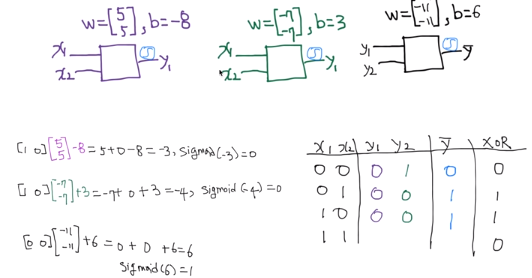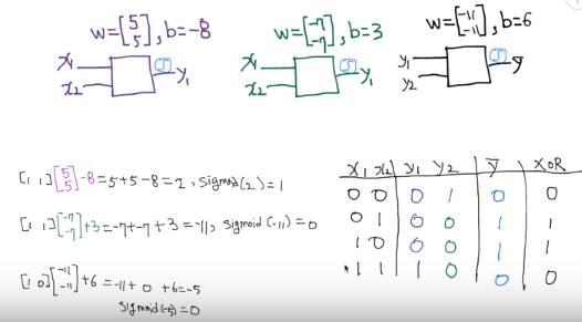 위와 같이 weight이 5,5이고 bias가 -8인 NN에서 나온 값을 y1으로, weight이 -7,-7이고 bias가 3인 NN에서 나온 값을 y2로 입력을 받아서 weight이 -11, -11이고 bias가 6인 NN을 거친 최종 값 Y hat을 결과로 가지는 NN 구조가 XOR의 결과와 같게 나오는지 직접 계산해보겠다.