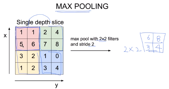 위의 예시를 보자. stride 2이므로 2칸씩 이동하고, 2 x 2 필터이므로 2 x 2의 결과가 나올 것이다. 각각의 필터에서 가장 큰 값을 뽑아낸다면 맨 오른쪽과 같은 결과가 나올 것이다. 필터와 stride를 어떻게 정하느냐에 따라 다음 결과의 크기가 정해진다.