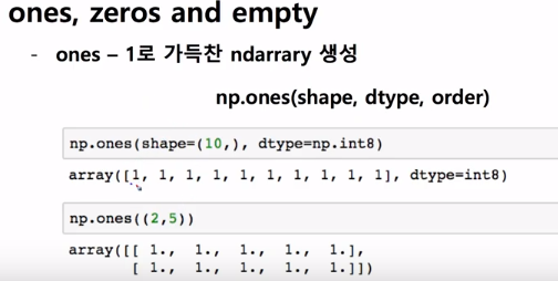 ones도 비슷하게 1로 가득찬 ndarray를 만드는 것이다.