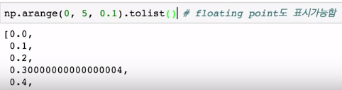 list처럼 numpy도 시작, 끝, step으로 범위를 지정할 수 있고, list와 달리 floating 포인트로 step을 표현할 수 있다는 것이