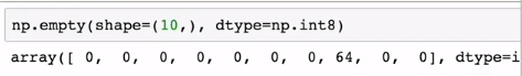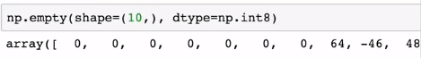 empty는 shape만 주어지고 비어있는 ndarray가 생성된다. 초기화가 되지 않기 때문에 이상한 값들이 들어있을 수 있다. 잘 쓸 일은 없을 것이라고 한다.