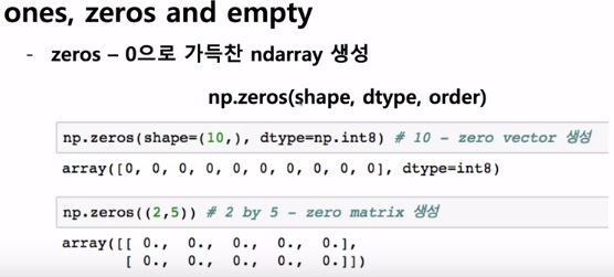 zeros는 0으로 가득찬 ndarray를 만드는 것인데 shape라고 키워드를 써도 되도 안 써도 된다. 데이터 타입도 지정할 수 있다.