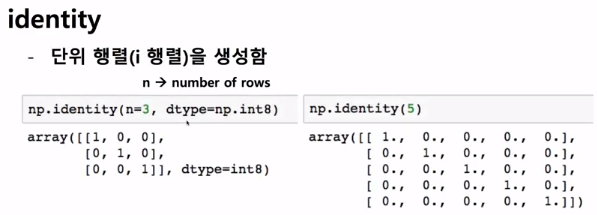 다음으로는 선형대수의 matrix에서 나오는 여러 개념들을 알아보도록 하겠다. n x n 형태의 단위행렬을 만들어준다.