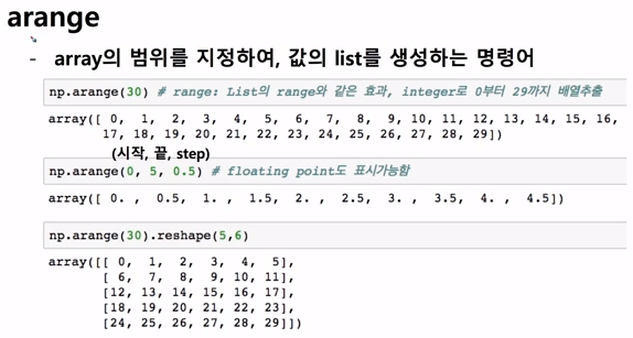 처음에 배울 것은 arange로 array를 지정해놓은 range에 따라서 만드는 것이다.