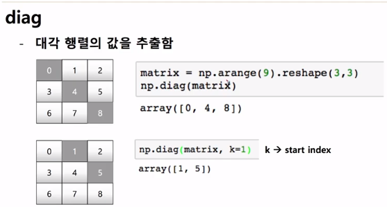 diag 함수는 대각 행렬의 값만 뽑아서 가져온다. eye와 마찬가지로 k로 시작 위치를 설정할 수 있다.