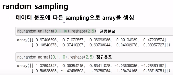 random sampling은 분표에 따른 값들을 가져올 수 있다. uniform이라고 표현되는 균등분포는 첫번째 argument에 최저값, 최고값, 데이터의 개수를 넘긴다. 이 경우에는 0에서 1까지 10개를 가져와서 2 x 5 모양으로 만들어준다.