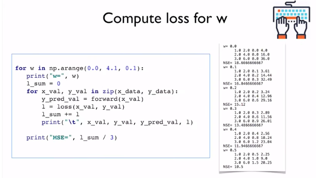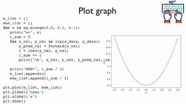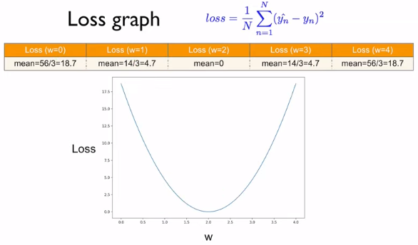 위의 w = 2일 때의 값은 매우 의미가 있는데, loss가 모두 0이 나와서 가장 정확한 예측값이기 때문이다.