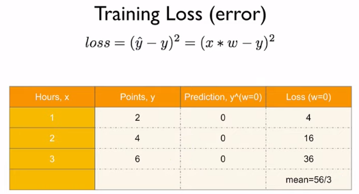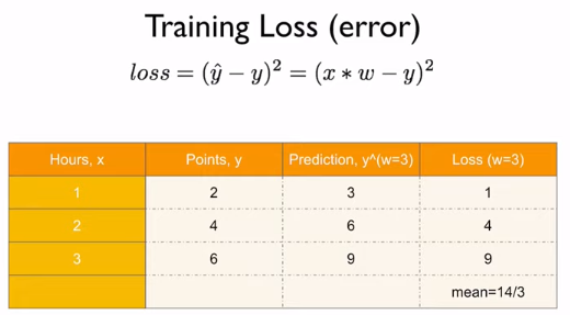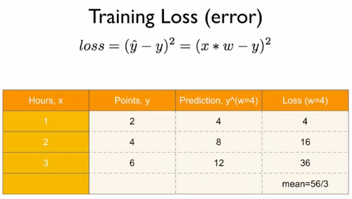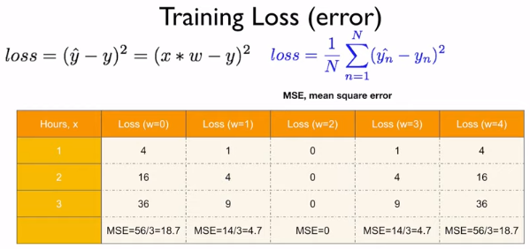 loss라고도 불리는 error은 실제 값인 y와 예측값인 y hat의 차의 제곱이다. 가중치 w는 랜덤 값이고 그에 따라 예측값 y hat은 변화할 것이다. 위의 예는 w = 3일 때의 loss이고, 이렇게 구한 loss들을 더해서 개수로 나눈 평균을 구한다.