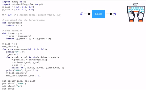 위의 그림의 오른쪽 선형 데이터가 Linear Regression의 가장 간단한 예이다. 아까 말했듯이 편향 b는 편의를 위해서 잠시 제거를 했으므로 우리의 예측 식은 y hat = x * w의 형태가 되는데, x는 이미 입력값으로 주어졌고, 가중치 w를 랜덤으로 결정한 뒤 다른 w 값들로 실험해보면서 가장 좋은 결과를 내는 가중치를 선택한다.