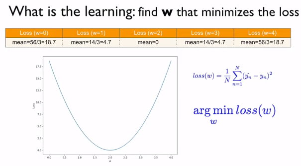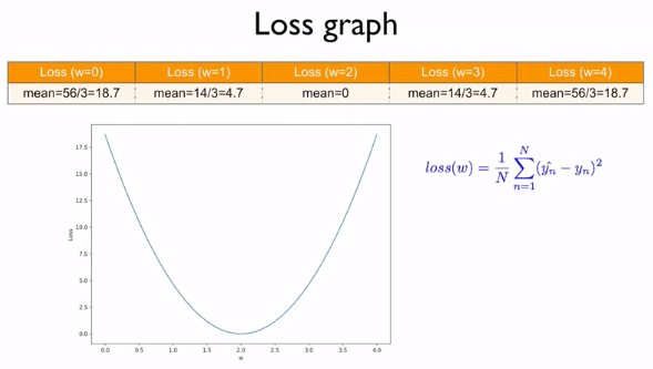 우리가 해야할 것은 손실 함수를 최소로 하게 하는 가중치 weight을 찾는 것이고, 이것을 pytorch에서는 argmin 함수로 알아낼 수 있다. 위의 arg_w_minloss(w)의 뜻은 우리가 loss(w)을 최소로 하는 weight을 찾고 싶다는 뜻이다.