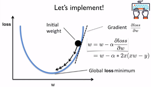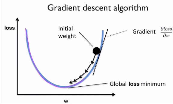 위의 식을 사용하여 점점 global loss minimum에 점점 다가가게 된다. 위에서 살펴봤듯이 만약 gradient가 +였다면 가중치 값이 최소값에 다다를 때까지 점점 낮아지게 될 것이고, gradient 값이 -였다면 점점 높아지게 될 것이다.