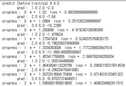 epoch는 에폭으로 읽고 얼마나 반복할지를 결정하고, 이 경우에는 0부터 99까지 100번 3개의 데이터에 대해서 반복했다. 시간이 지날수록 loss가 점점 줄어드는 것을 볼 수 있고 그만큼 더 알맞은 가중치의 값으로 다가가고 있다.
