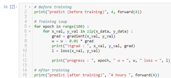 처음에는 초기 가중치 값이 임의로 설정된 1.0이었고, 4시간을 공부한다면 4.0점을 받을 것이라고 예측했지만, 100버능의 학습을 한 뒤에는 7.9정도의 점수를 받을 것이라고 예측하게 되고 정답은 8이므로 맞다고 할 수 있다.