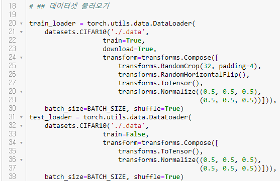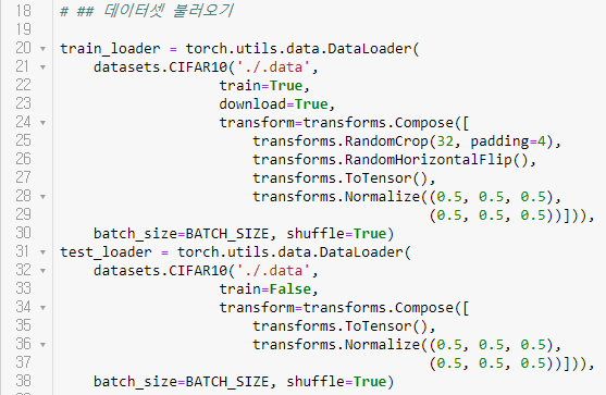 앞에서 사용한 MNIST dataset과 달리 CIFAR-10 데이터셋을 불러온다. overfit을 방지하기 위해 RandomCrop과 RandomHorizontalFlip 등의 노이즈를 추가한다.