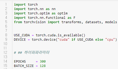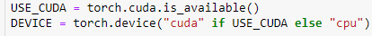 USE_CUDA는 계산을 가속해주는 CUDA를 쓸 수 있는지 확인해주고, DEVICE는 USE_CUDA의 결과에 따라 데이터를 CUDA(GPU) 혹은 CPU로 보내도록 가리키는 역할을 한다.
