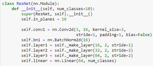 self.in_plains 변수는 self._make_layers() 함수에서 각 층을 만들 때 전 층의 채널 출력값을 기록하는 데 씅니다. layer1 층이 16개 채널을 입력받으므로 16으로 초기화해준 것이다.