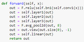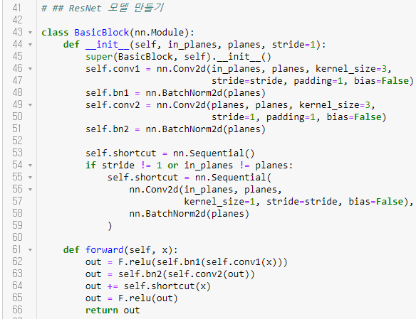 데이터의 흐름을 나타내는 forward는 다음과 같다. 입력이 들어오면 컨볼루션, 배치 정규화, 활성화 함수를 거치고, 다시 처음 입력을 self.shortcut을 거쳐서 크기를 같게 하고 활성화 함수를 거친 값에 더하고 그것을 ReLU 활성화 함수를 통과시켜 최종 출력을 만든다.
