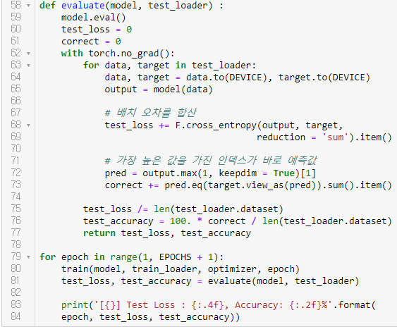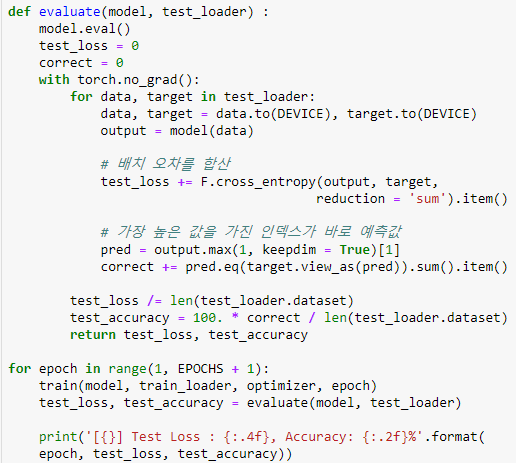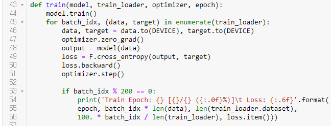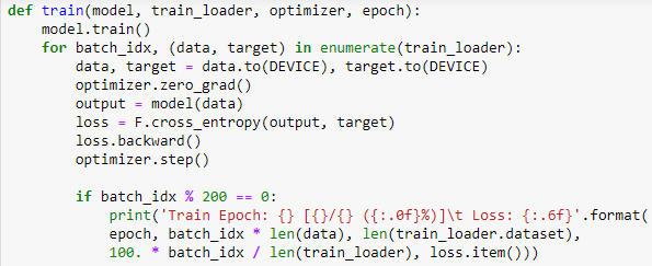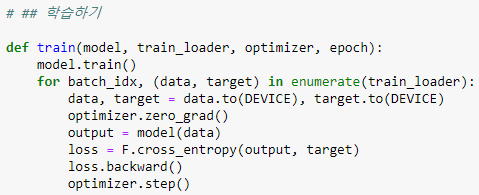 모델을 train 모드로 놓은 후, 데이터셋에서 배치를 가져와 모델에서 출력값을 뽑고, F.cross_entropy() 오차 함수를 이용하여 모델 출력값과 정답인 target값 사이의 오차값을 계산한다. backpropagation을 실행해주는 loss.backward() 함수를 통해 기울기를 계산하고, 최적화 함수인 optimizer.step()으로 구한 기울기값을 사용해 모델의 학습 파라미터를 갱신한다.