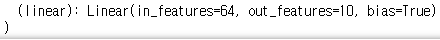 self.conv1 층은 3 x 3의 필터로 이미지의 RGB 3색을 16개의 채널로 만든다. 각 층을 지나면서 16 x 32 x 32, 32 x 16 x 16, 32 x 16 x 16, 64 x 8 x 8크기의 텐서를 가지게 된다. 끝에는 평균 풀링을 사용하여 텐서의 원소의 개수를 64개로 만들고 그만큼 입력을 받아서 10개마다 예측값을 낸다.