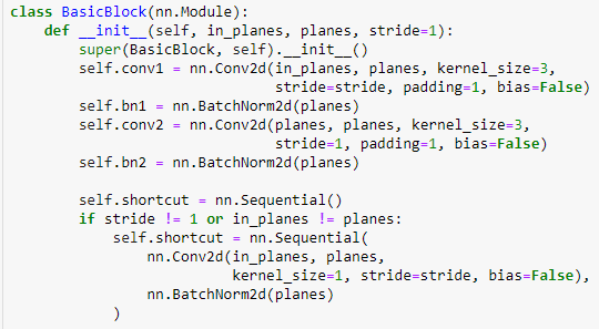 Resnet은 두 번째 블록부터 in_planes를 받아서 self.bn2 계층의 출력 크기와 같은 planes와 더해주는 self.shortcut 모듈을 정의한다.
