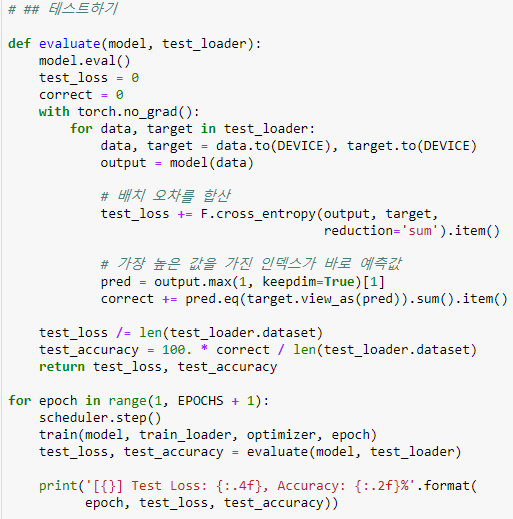 학습은 이전과 비슷하지만 달라진 점은 scheduler.step() 함수로 학습률을 조금 낮춰주는 단계가 추가되었다.