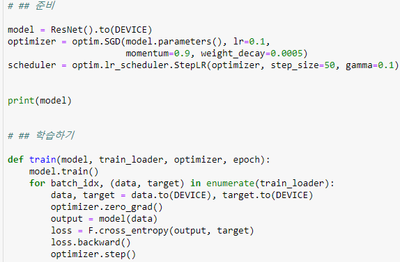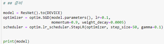 모델을 사용해보자. 학습률 감소(learning rate decay) 기법을 사용해서 학습이 진행하면서 최적화 함수의 학습률을 점점 낮춰서 더 정교하게 최적화하도록 한다. 파이토치의 optim.lr_scheduler.StepLR 도구로 간단하게 할 수 있고, 이 때 Scheduler는 이폭마다 호출되며 step_size를 50으로 지정해주어 50번 호출할 때 학습률에 0.1(gamma값)을 곱해서 0.1로 시작하면 0.01로 마지막에 줄어든다. 마지막으로 model을 출력하면 처음부터 끝까지 모든 계층이 어떻게 생겼는지 볼 수 있다.