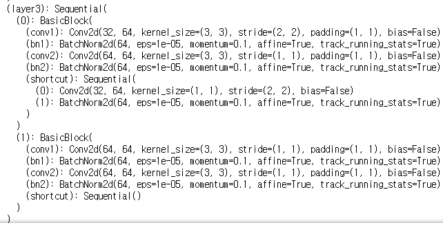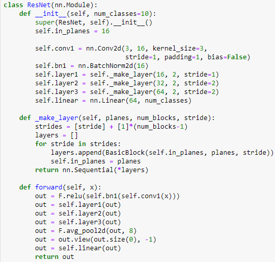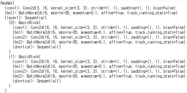 ResNet 클래스에서는 이미지를 받아서 컨볼루션과 배치정규화 층을 거친 후 여러 개의 BasicBlock 층, 평균 풀링, 신경망을 거쳐서 예측을 출력한다. self.make_layer() 함수는 파이토치의 nn.Sequential 도구로 여러 BasicBlock을 모듈 하나로 묶는 역할을 한다. 이 함수가 반환한 layer 객체는 컨볼루션 계층처럼 nn.Module로 다룰 수 있다.