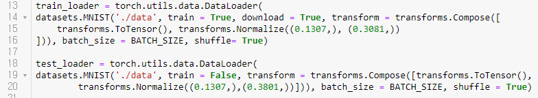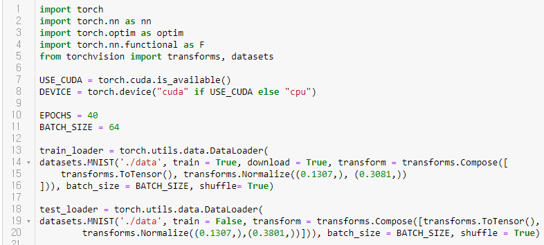 학습용과 테스트용 데이터셋을 불러온다. transform을 이용한 전처리는 파이토치 텐서화와 정규화(normalization)만 한다. 커널 크기는 5 x 5, 컨볼루션 계층은 2개로 정의할 것이다.