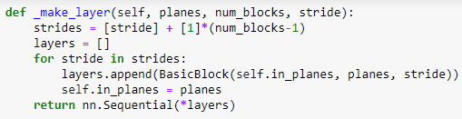 self._make_layer 함수에서는 self.in_planes 채널 개수로부터 직접 입력받은 인수인 planes 채널 개수만큼을 출력하는 BasicBlock을 생성한다.