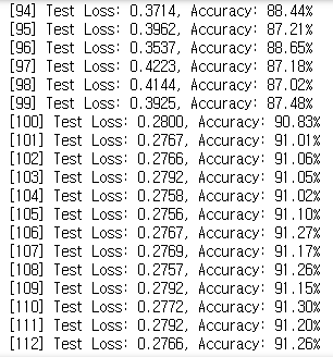 결과는 위와 같다. 정확도가 91% 정도가 나오는데 CIFAR-10이 성능을 충분히 올리기에 다소 작은 데이터셋이기 때문에 그렇다. 더 큰 데이터셋을 사용하여 학습 데이터를 늘리면 오차가 작아진다.