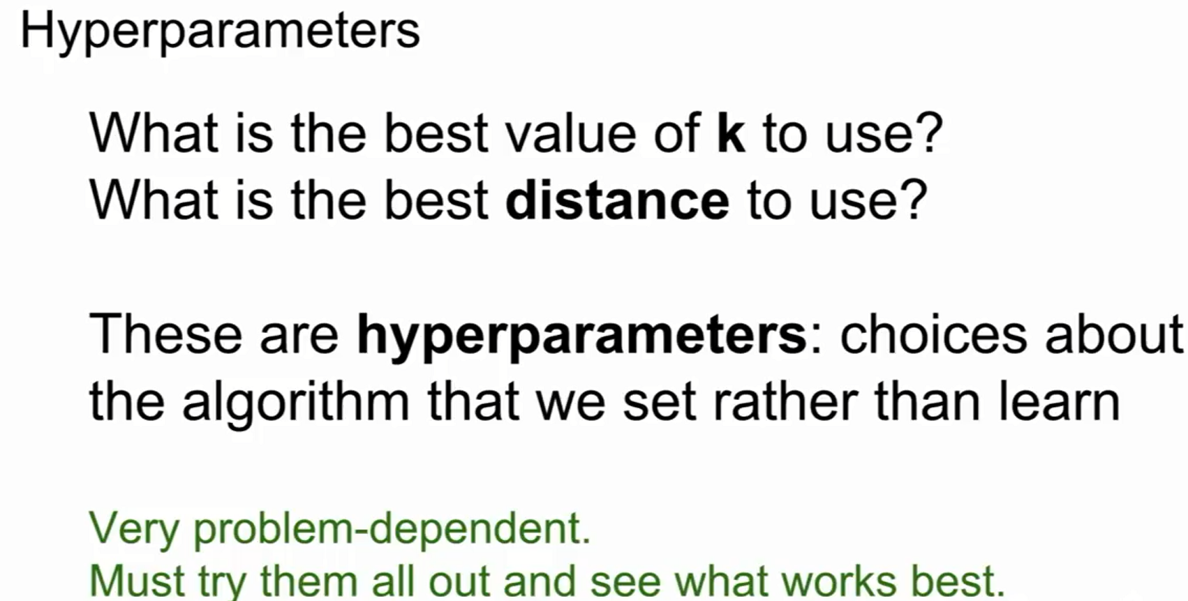 실제로 k-NN을 사용하려고 한다면 반드시 선택해야하는 몇 가지 항목이 있는데 앞에서 설명한 k, L1/L1같은 거리 척도 외에도 어떻게 하면 내 "문제"와 "데이터"에 꼭 맞는 모델을 찾을 수 있을지 잘 생각해봐야한다. K와 거리 척도를 "하이퍼 파라미터"라고 한다.