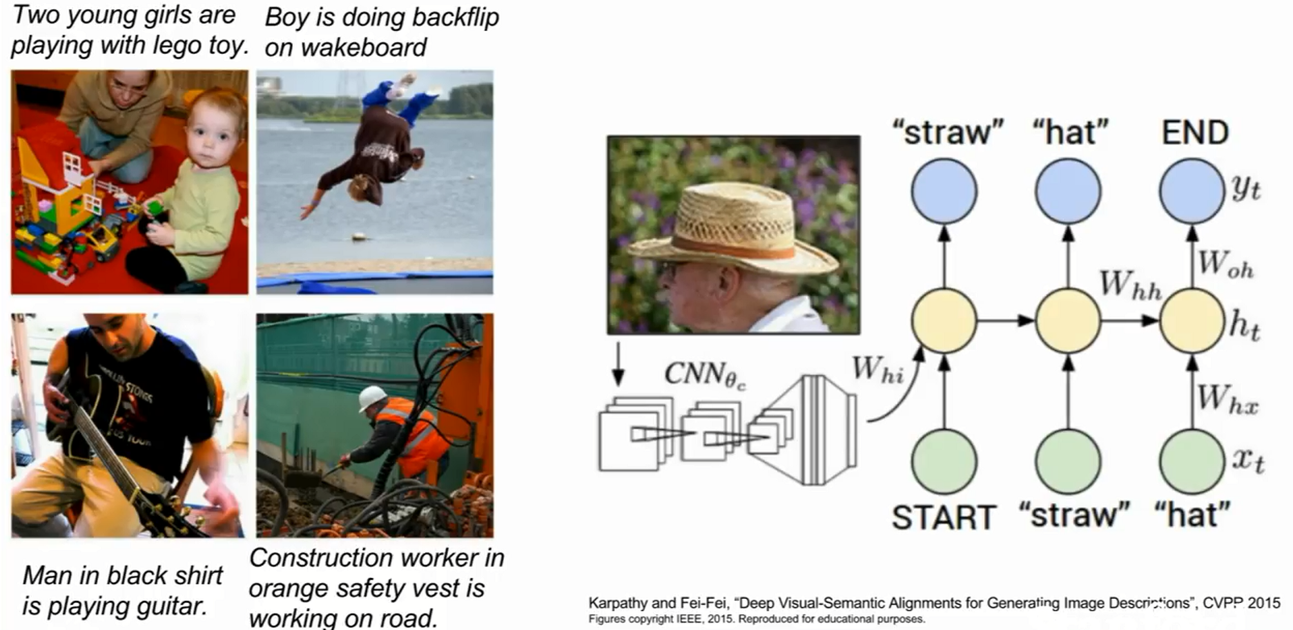 이미지를 인식하기 위해서 CNN을 사용하고, 그리고 언어를 인식하기 위해서는 RNN을 사용한다. 우리는 그저 CNN과 RNN을 레고 블럭처럼 붙히고 한 번에 학습시키고, 그러면 이렇게 어려운 문제도 해결할 수 있다.