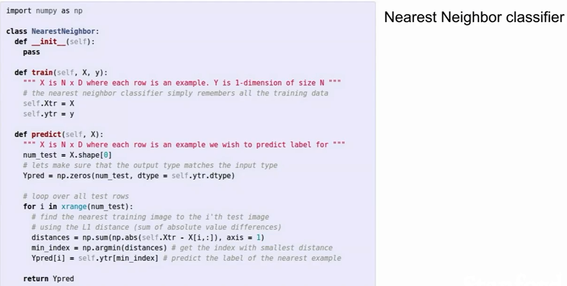 첫번째로 볼 단순한 classifier은 Nearest Neighbor(NN)인데, train step에서는 단순히 모든 학습 데이터를 기억한다. Predict step에서는 새로운 이미지가 들어오면 새로운 이미지와 기존의 학습 데이터를 비교해서 가장 유사한 이미지로 레이블링을 예측한다.